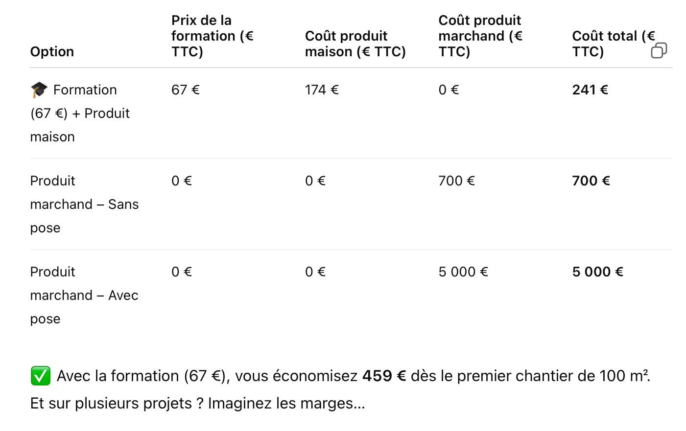 Voici une comparaison simple entre ma méthode et l’achat de produits chez un distributeur professionnel pour un chantier de 100 m² :